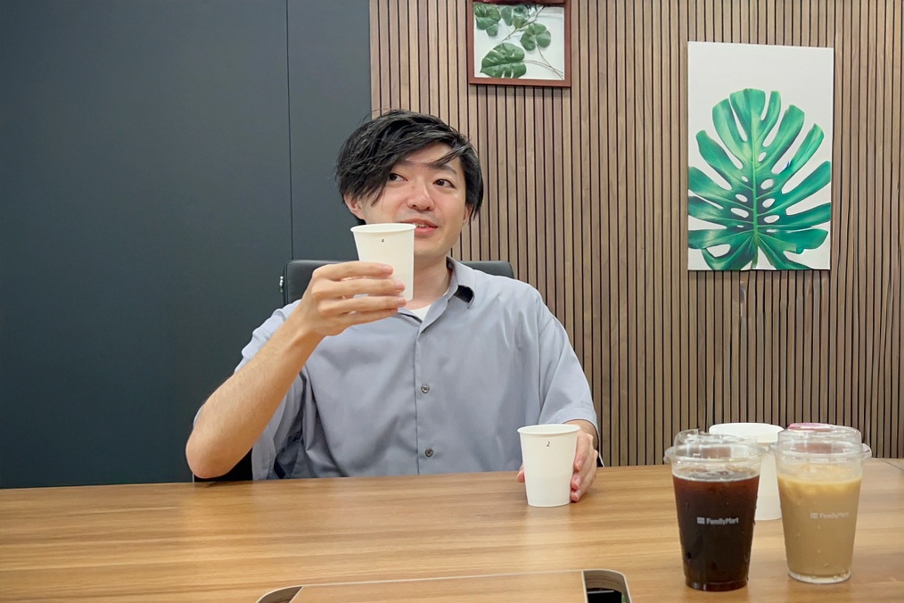 満足げな表情。さすが、普段からセブンを愛飲しているM岡さん。一口でいつものコーヒーを見抜いた。